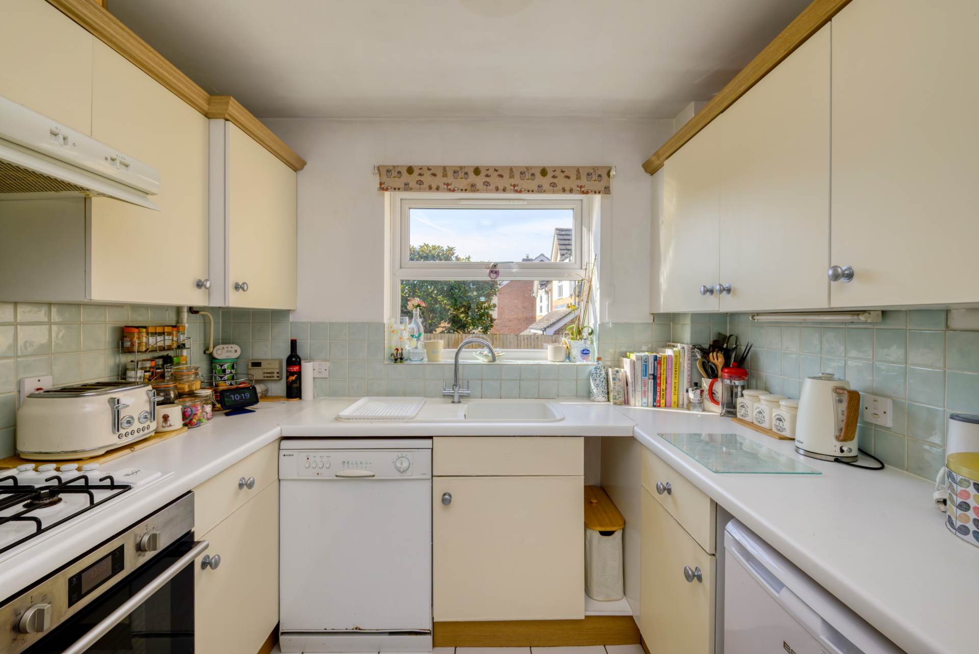 Kitchen: 9'6" x 7'6" double glazed rear aspect. Range of eye and base level units with roll edge tops and tiled surround, sink with mixer tap and single drainer, integrated four-ring gas hob with extractor above and electric oven under. Space and plumbing for a dishwasher, further appliance space, tiled flooring, radiator and door to the garage.